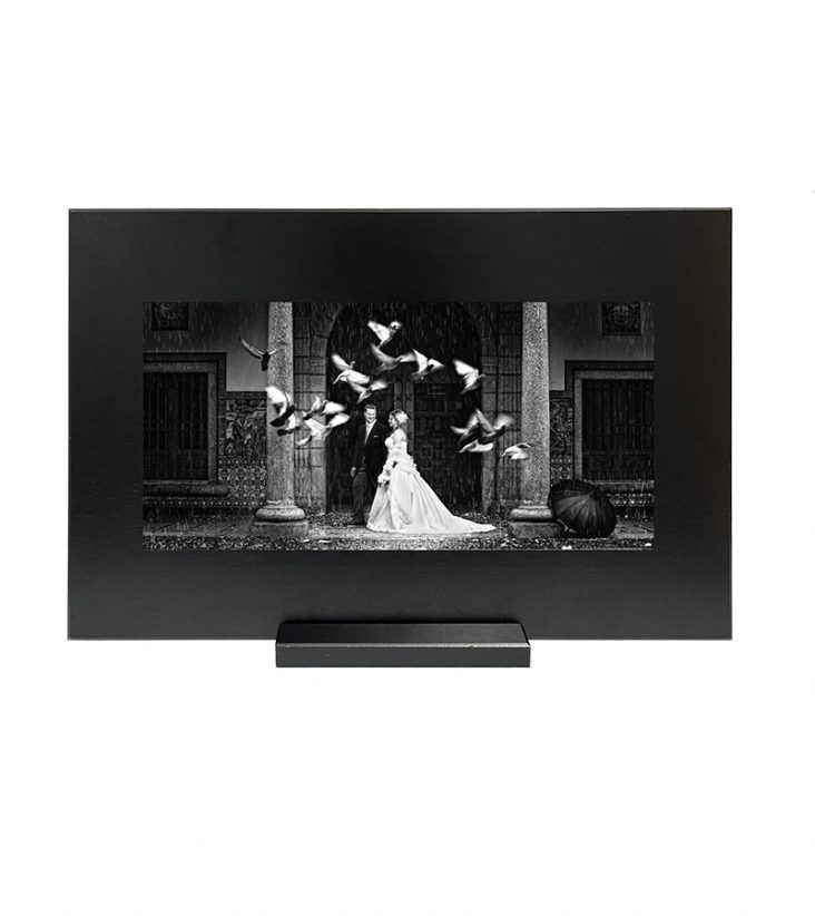 Impresión en papel fotográfico montada tras un metacrilato de 5mm pegada sobre fondo de madera de 4mm con margen perimetral de 5cm (efecto passe-partout). Incluye soporte de mesa en madera a conjunto con el fondo.